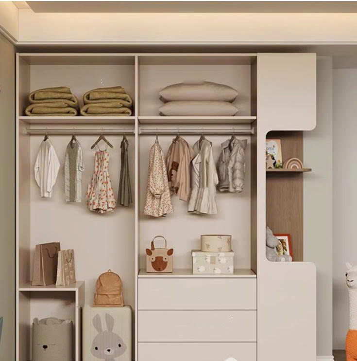 Tủ gỗ quần áo trẻ em được thiết kế các ngăn chứa đồ, kéo ra kéo vào thuận tiện. Bạn có thể dễ dàng phân loại từng ngăn để đồ như ngăn đựng áo, ngăn đựng quần, ngăn để các vật dụng thời trang khác,… vừa là để tạo sự gọn gàng ngăn nắp, vừa giúp bé dễ dàng khi lấy đồ của mình.